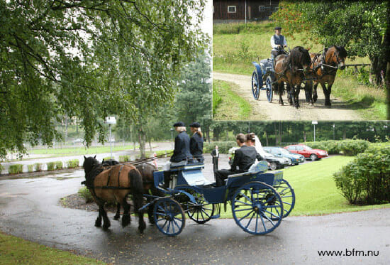 Brun, premierad nordsvensk hingst + valack i par framför blå åkvagn från 1800-talet eller enbet framför vagnsgrön Victoria promenadvagn. Champagne i vackra glas ingår till alla åkande. Företaget har F-skattsedel och erfoderliga försäkringar för verksamheten. Tar uppdrag i Storgöteborg.